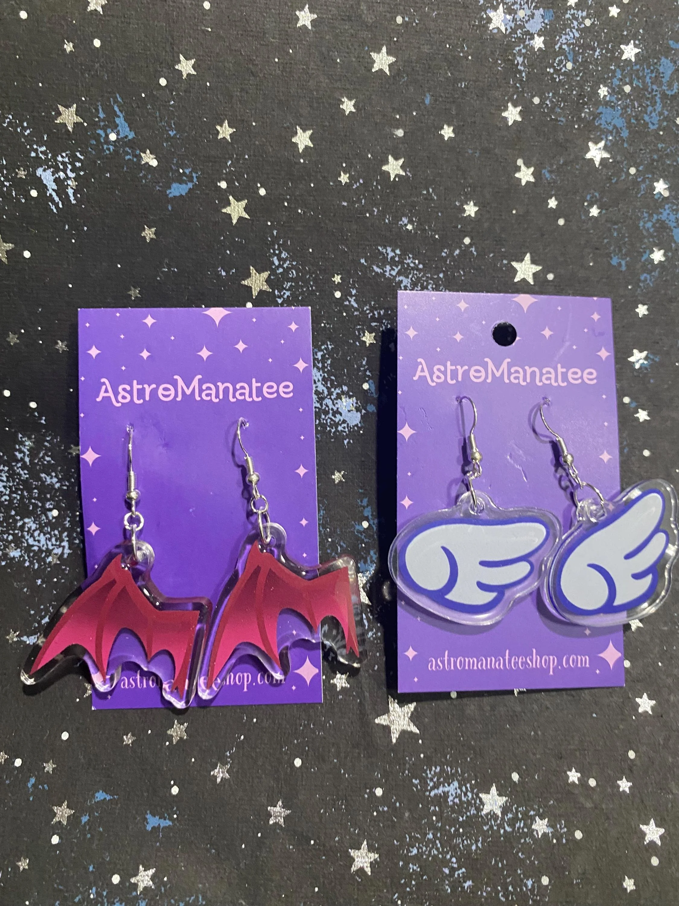 These durable, handmade earrings are made with shrink plastic, stainless steel earring pieces and covered with resin so they are more durable and waterproof. They are made to dangle 1.5”. Everything is made by hand so no two are the exact same. They are packaged with a backing card in a plastic bag. **Plastic bag is optional if you want to reduce waste.